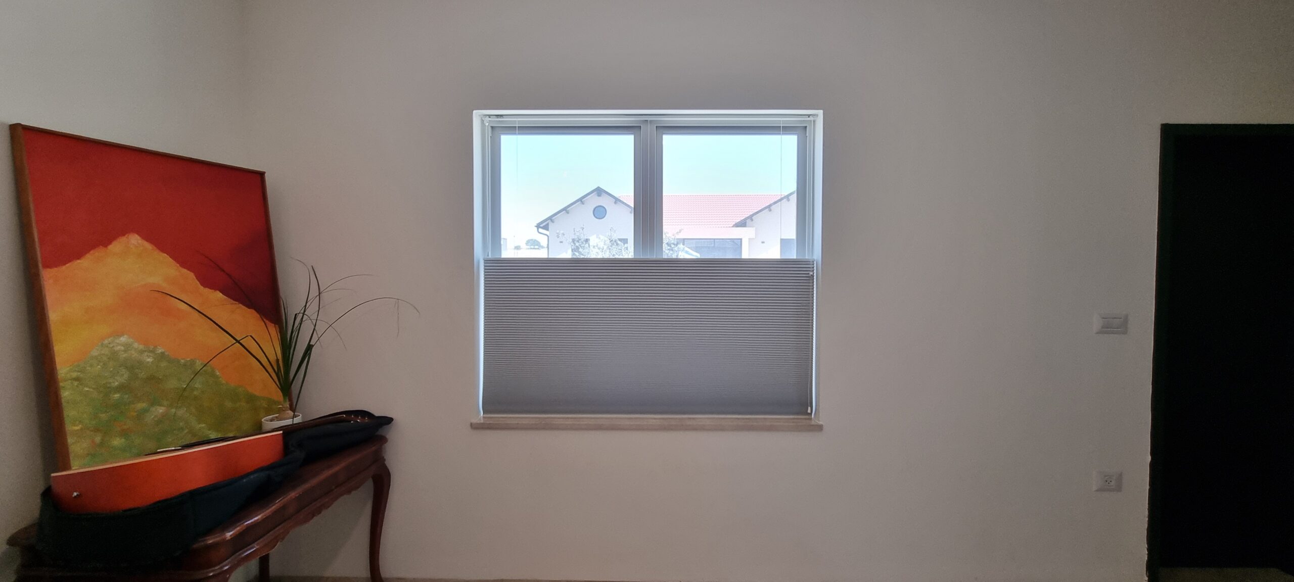 וילון דואט לבית בגוון אפור בהיר, בעיצוב אלגנטי וחכם המשלב פרטיות עם חדירת אור טבעי. אידיאלי לחללים פרטיים ומוארים, מעניק בידוד תרמי ותחושת רוגע עיצובית ונקייה.