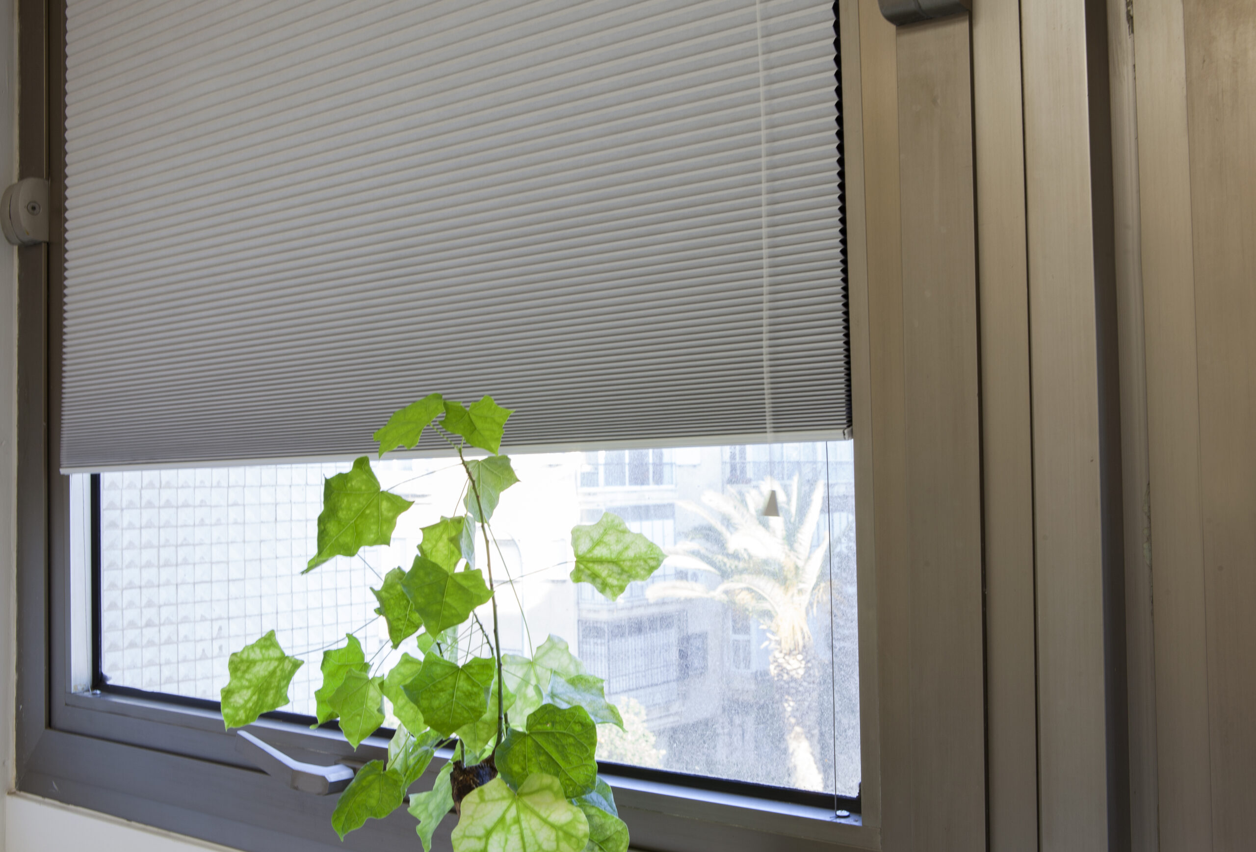 וילון דואט אפור במראה נקי ומודרני, מותקן בחלון אלומיניום. מבט מקרוב על הטקסטורה ההרמונית של הקפלים והאור החודר דרכו בעדינות. פתרון אלגנטי המספק הצללה, בידוד ותחושת רוגע בחלל.