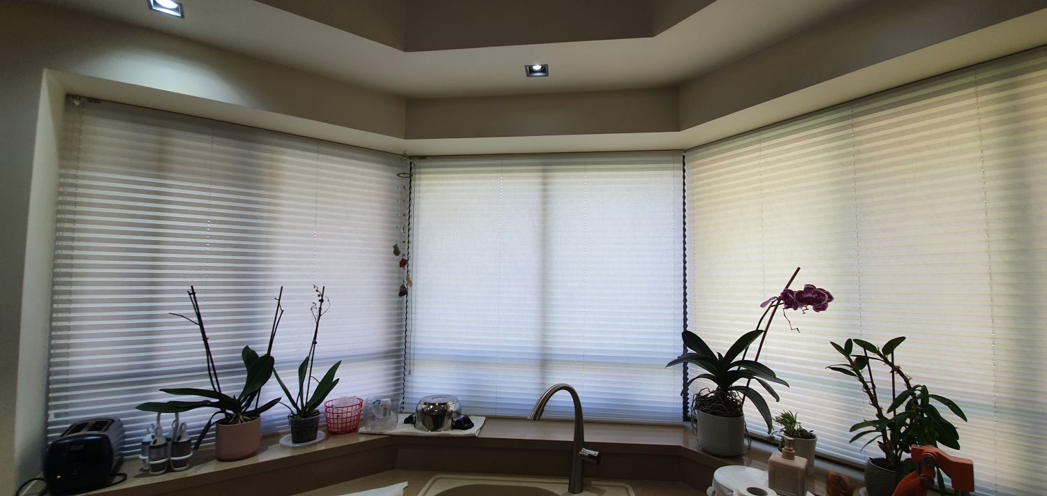 וילונות פליסה מותקנים במטבח עם חלונות פינתייים רחבים. מאפשרים חדירה רכה של אור טבעי תוך שמירה על פרטיות, משתלבים באופן אלגנטי עם עציצים ופרחים ליצירת אווירה חמימה, מוארת וטבעית.
