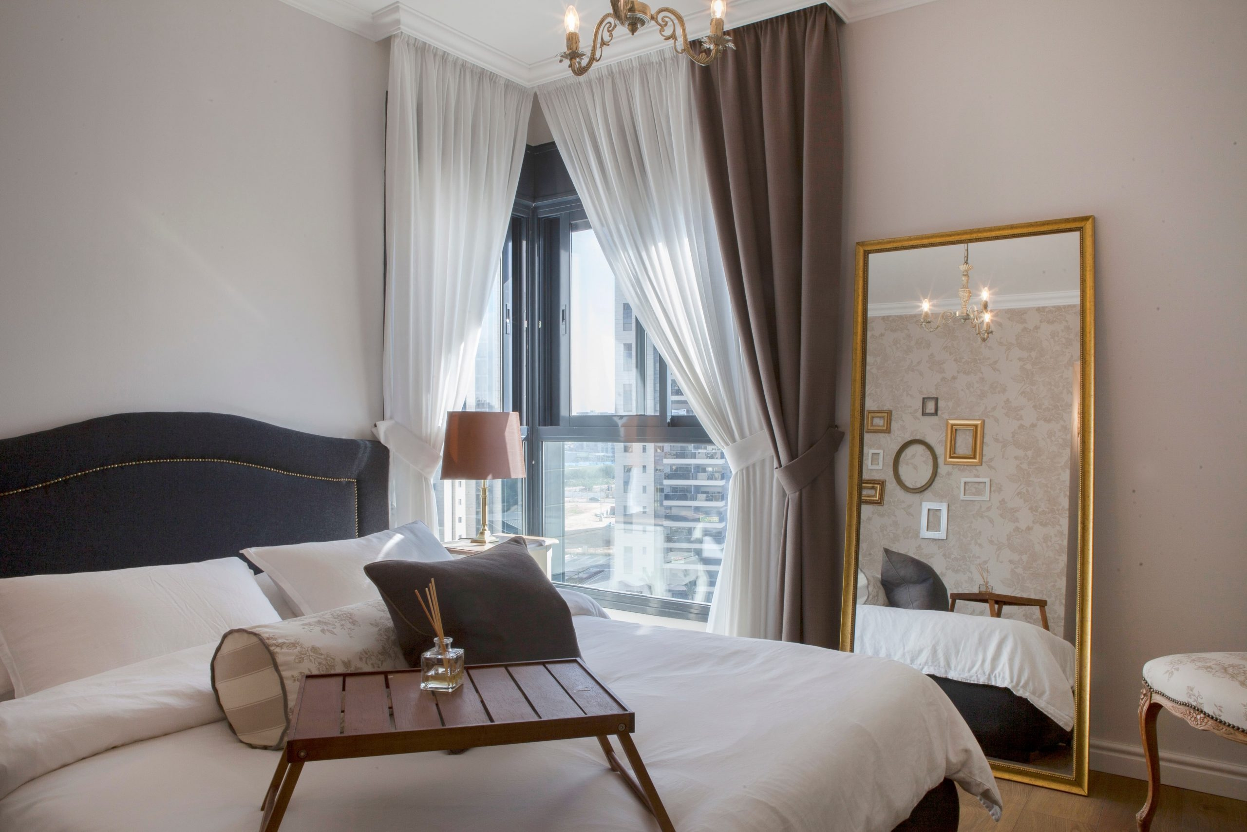 וילון בד פשתן בגוון לבן רך, משולב עם שכבת הצללה כהה ליצירת עומק ואלגנטיות בחדר השינה. השילוב בין הבדים מאפשר שליטה באור ובפרטיות, ומוסיף חמימות, רכות וסגנון קלאסי לחלל אינטימי ומעוצב.